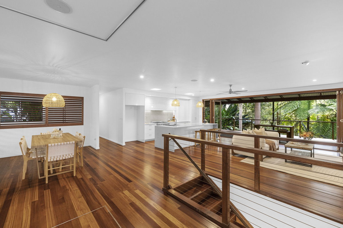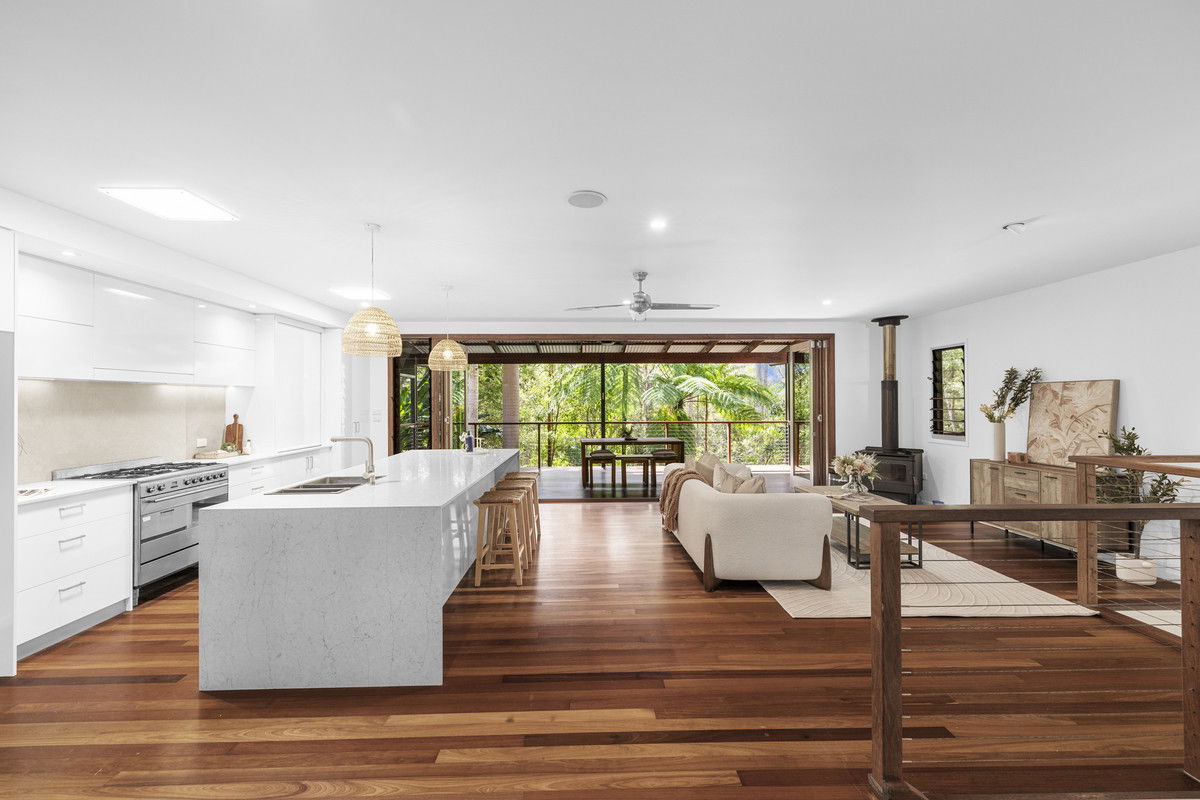 Tucked away behind a natural curtain of established rainforest and native vegetation, this expansive two-hectare holding delivers rare seclusion without sacrificing convenience. The estate combines a striking multi-level residence, substantial outbuildings, and flexible access points, all positioned less than half an hour from the coast creating an enviable balance between tranquil hinterland living and easy access to urban and beachside amenities.